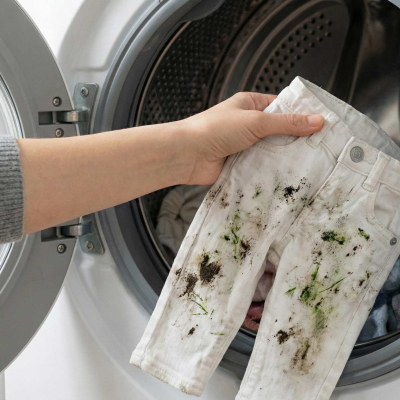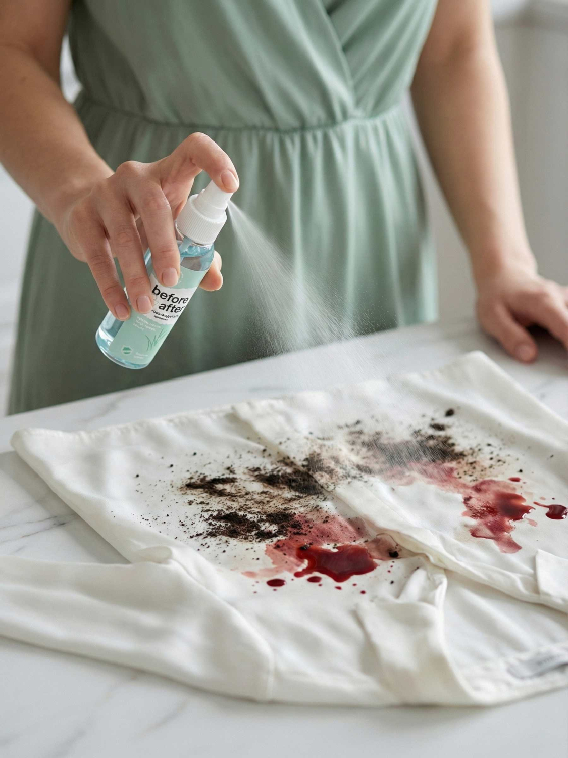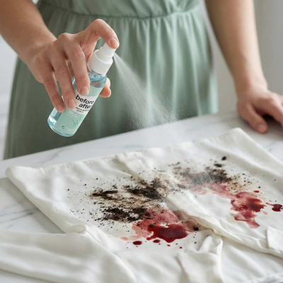 Распылите средство на загрязнённые участки ткани до её увлажнения. Выдержите 5-10 минут, при сильном загрязнении можно протереть мягкой чистой тканью или щеткой, и, не допуская высыхания ткани, постирать её как обычно, хорошо прополоскать